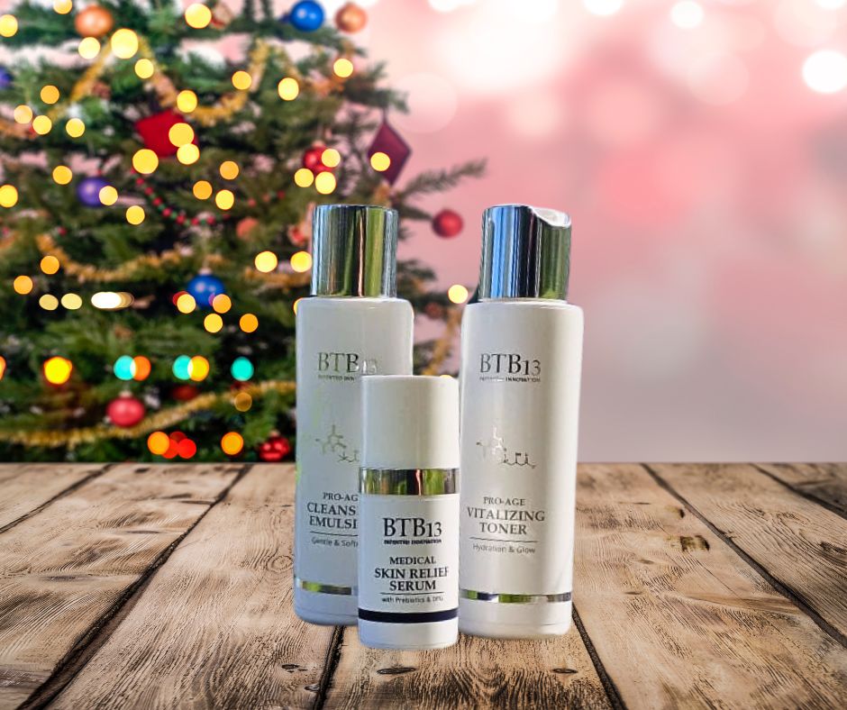 Tuotepaketti sisältää BTB13 Pro-Age puhdistusemulsion 100 ml, BTB13 Pro-Age hoitoveden 100 ml ja BTB13 Medical Skin Relief seerumin 15 ml. 🎄